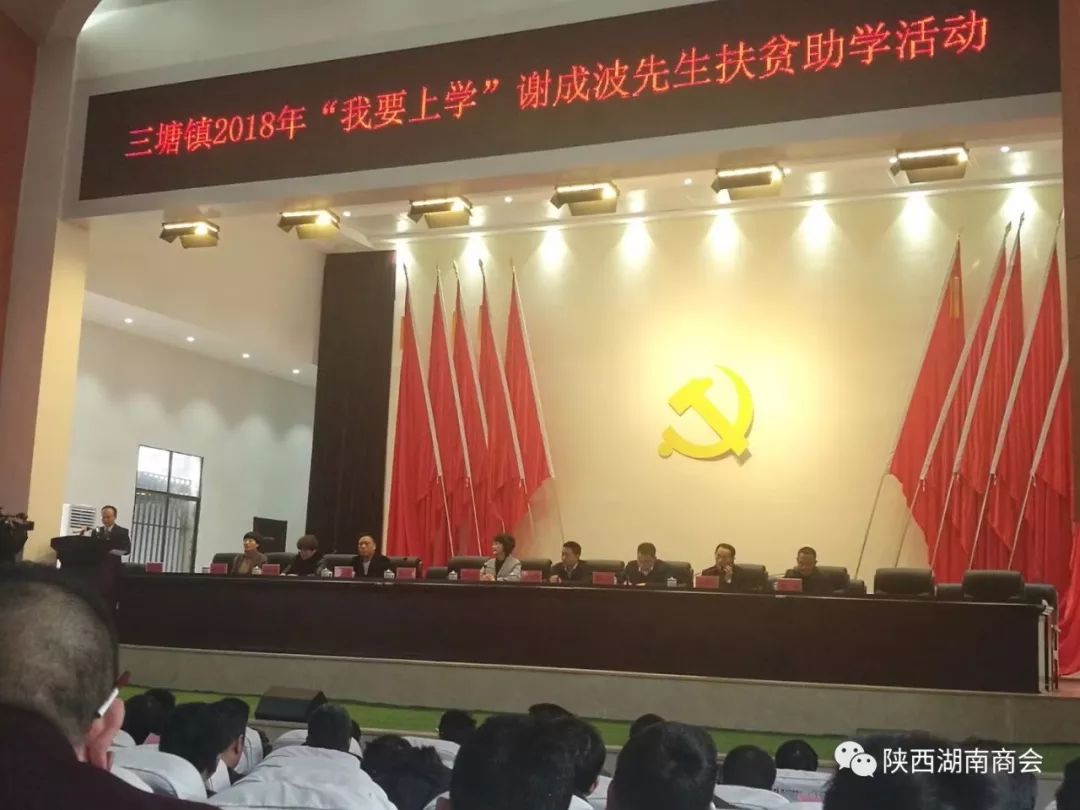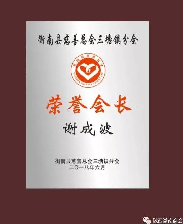6月20日,湖南省衡阳市慈善协会乡镇分会三塘慈善分会正式挂牌成立。陕西省湖南商会会长谢成波当选荣誉会长。谢会长致富不忘家乡,长期致力于家乡教育和扶贫事业。党的十九大召开后,谢会长积极响应党中央精准扶贫的号召,在本次6月20日,三塘慈善分会成立仪式上,谢成波会长再次为家乡捐赠20万元。