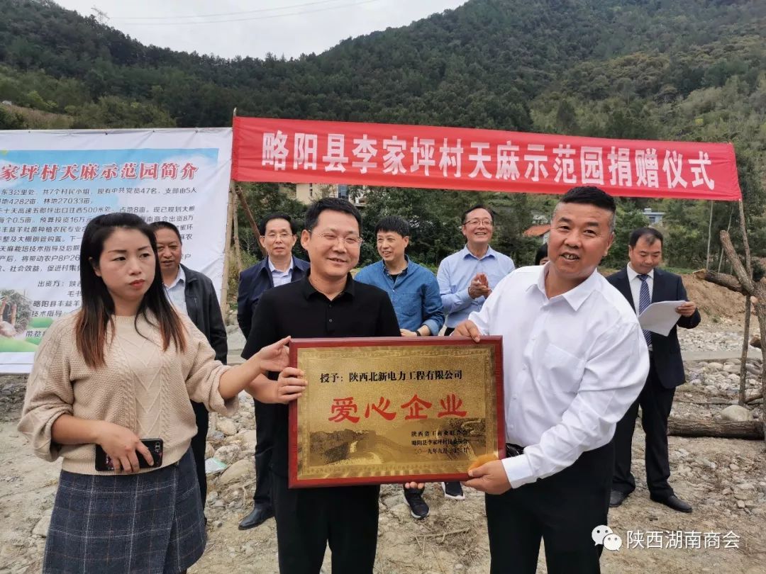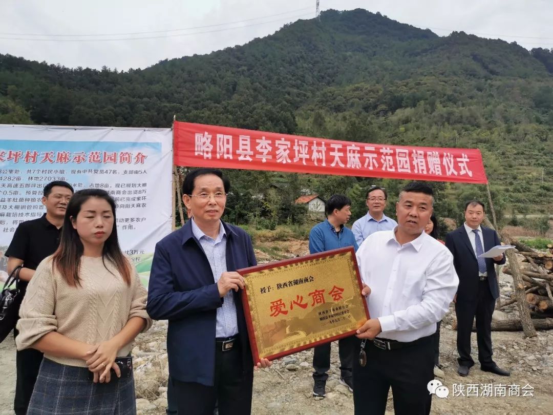 捐赠仪式上商会为天麻示范园捐赠了8万元。省工商联、李家坪村委会共同为陕西省湖南商会、商会企业代表分别颁发了“爱心商会”“爱心企业”荣誉牌。