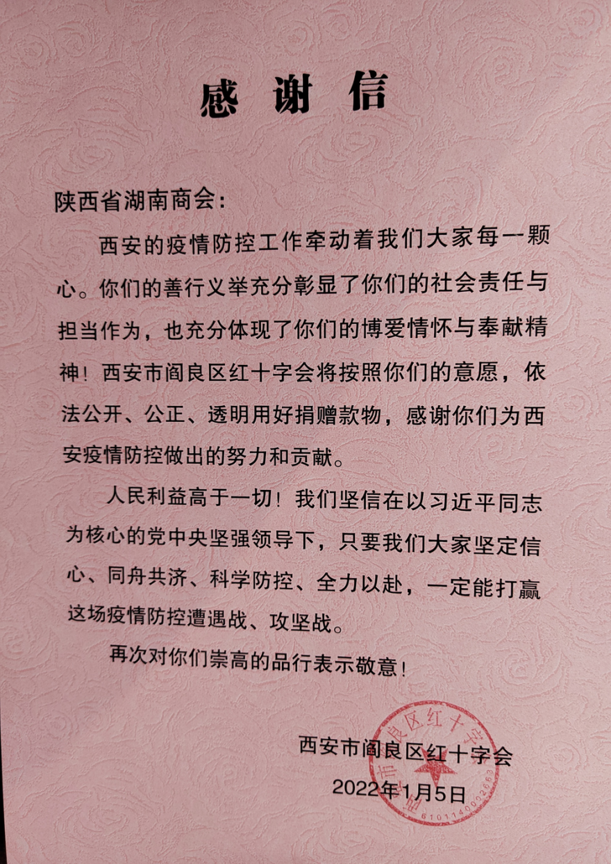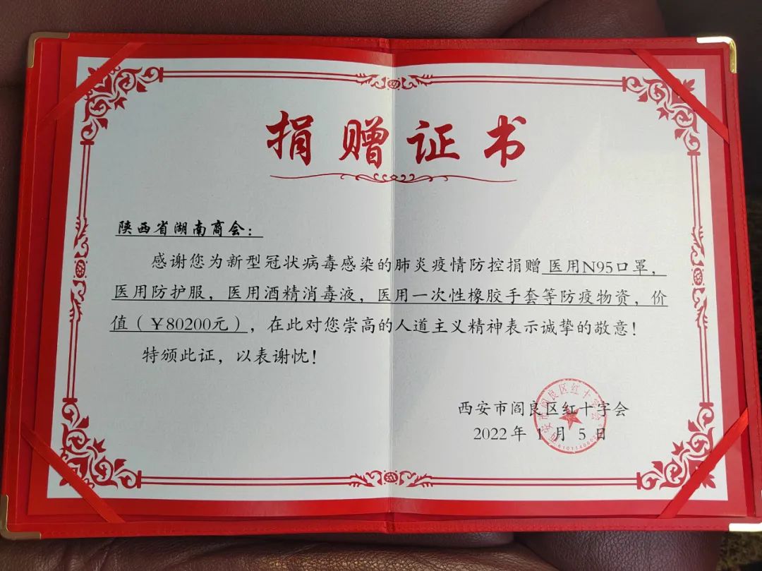 捐赠仪式上,潘焕乔部长对陕西省湖南商会及商会企业家们的勇于担当、奉献大爱,为疫情防控做出的积极贡献表示衷心的感谢,并表示商会的捐赠行为充分体现了强烈的大局意识,奉献意识和担当精神。捐赠现场,张红花副区长为陕西省湖南商会颁发了捐赠证书。