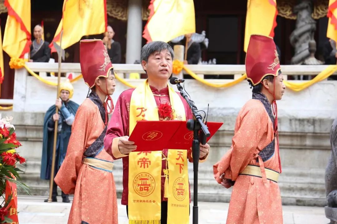 9:43,嘉宾主持人韩顺华介绍活动背景及出席祭舜大典的领导、嘉宾;9:50,主持人唐松成宣布:“癸卯年全球湘商祭舜大典开始。祭舜大典仪式共有九项仪程。击鼓9通,鸣金9响;16位礼生向舜帝敬献三牲、五谷、百果;主祭人张健盥手、上香、酹酒;全体肃立,向舜帝圣像三鞠躬,虔诚致敬。在庄严肃穆的气氛中,张健恭读《祭舜帝文》:“巍巍帝舜,穆穆吾皇。至孝至德,万古流芳。渔陶耕稼,可颂可彰。四岳咸荐,义感陶唐。百揆四门,治理有方。璇玑玉衡,七政齐张……湘商朝舜,承先祖之遗德;诚信天下,谱千秋之华章。经世致用,忠毅担当其不已;继往开来,创新图强其未央。帝祖庇佑,振实业以报国;赤子奋发,尊商道以流长。四海归心,国泰民安万家乐;九州圆梦,政通人和共荣光”。字字句句,颂扬了舜帝开创道德文明的丰功伟绩;表达了对中华民族人文始祖、中华道德文化创始人,中华商业文明开创者、诚信精神首倡者舜帝的尊崇和敬仰之情。